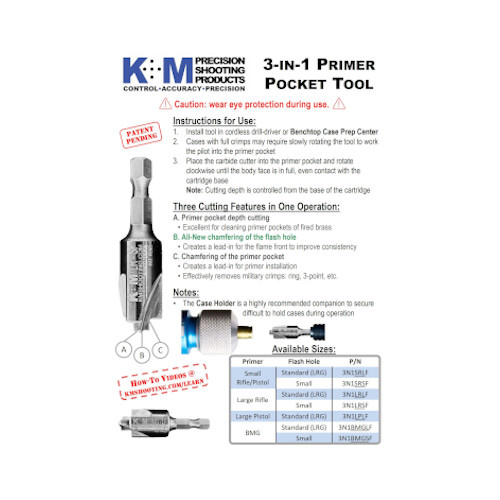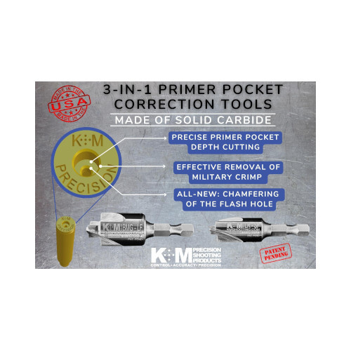 Karbidová frézka na lůžka zápalek K+M 3v1 kombinuje tři funkce úpravy nábojnice v jediné operaci: